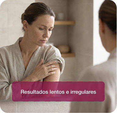 Axilas que você evita levantar. Virilha mais escura do que antes. Pele áspera, opaca, marcada pelo atrito, lâmina e depilação.